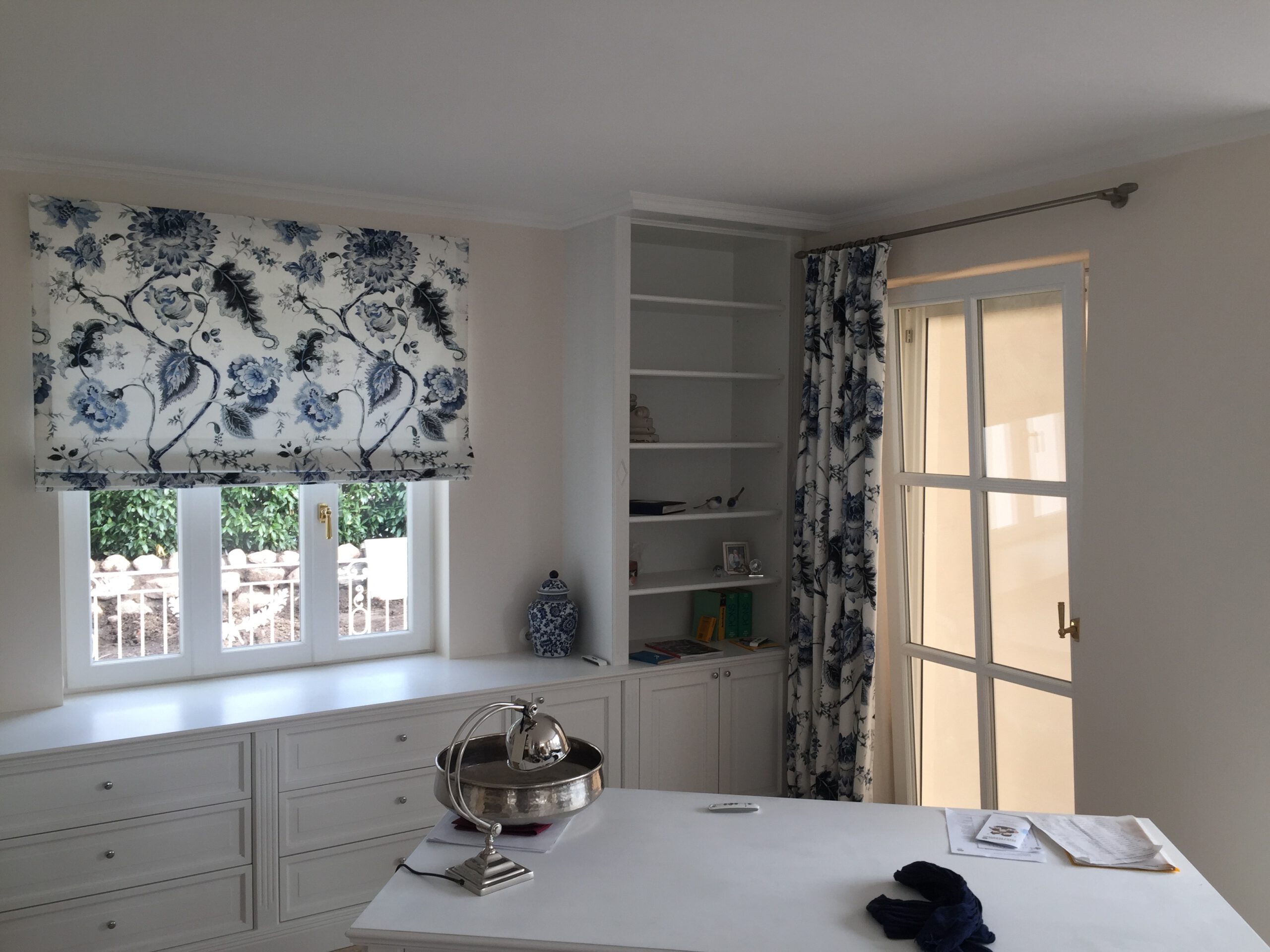 Harmonische Kombination aus Raffrollos und Vorhängen mit traditionellem Muster in einem luxuriösen Interieur. Jetzt bestellen.