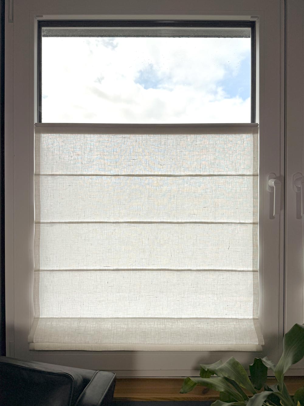 Das Bild zeigt ein halb heruntergezogenes weißes Raffrollo mit abgenähten Biesen und Stäben. Es ist aus lichtdurchlässigem Leinenstoff gefertigt und in einem modernen Fensterrahmen montiert. Das Raffrollo hat durchgehende Griffleisten, damit man es in der Höhe verschieben kann - von unten nach oben und von oben nach unten. Perfekt für eine elegante und funktionale Fensterdekoration in Innenräumen.